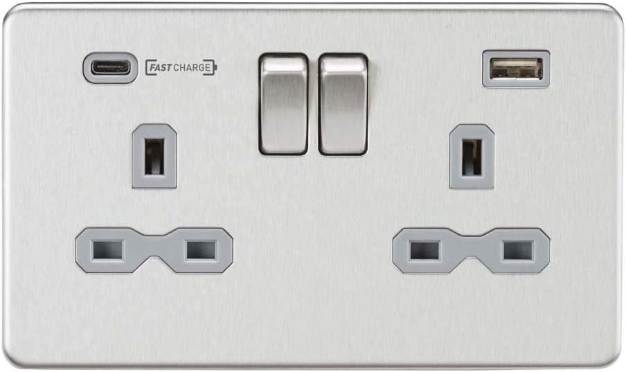 Knightsbridge Sfr9907 13a 2g Dp Switched Socket With Dual Usb Charger With A Type C Fastcharge Port Brushed Chrome With Grey Insert Amazon Co Uk Diy Tools