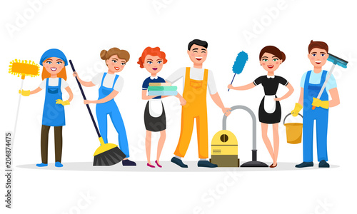 Cleaning service staff smiling cartoon characters isolated on white background. house cleaners dressed in uniform vector | CanStock